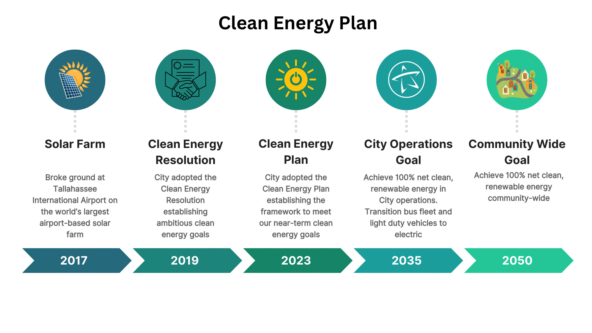 Adopted in August 2023, the City’s Clean Energy Plan identifies 85+ action items across all City departments related to renewable energy, energy efficienc, and clean transportation. Implementation of the Clean Energy Plan is well underway with various projects in process, some of which are highlighted below. Access the City’s Clean Energy plan at Talgov.com/CleanEnergyPlan.